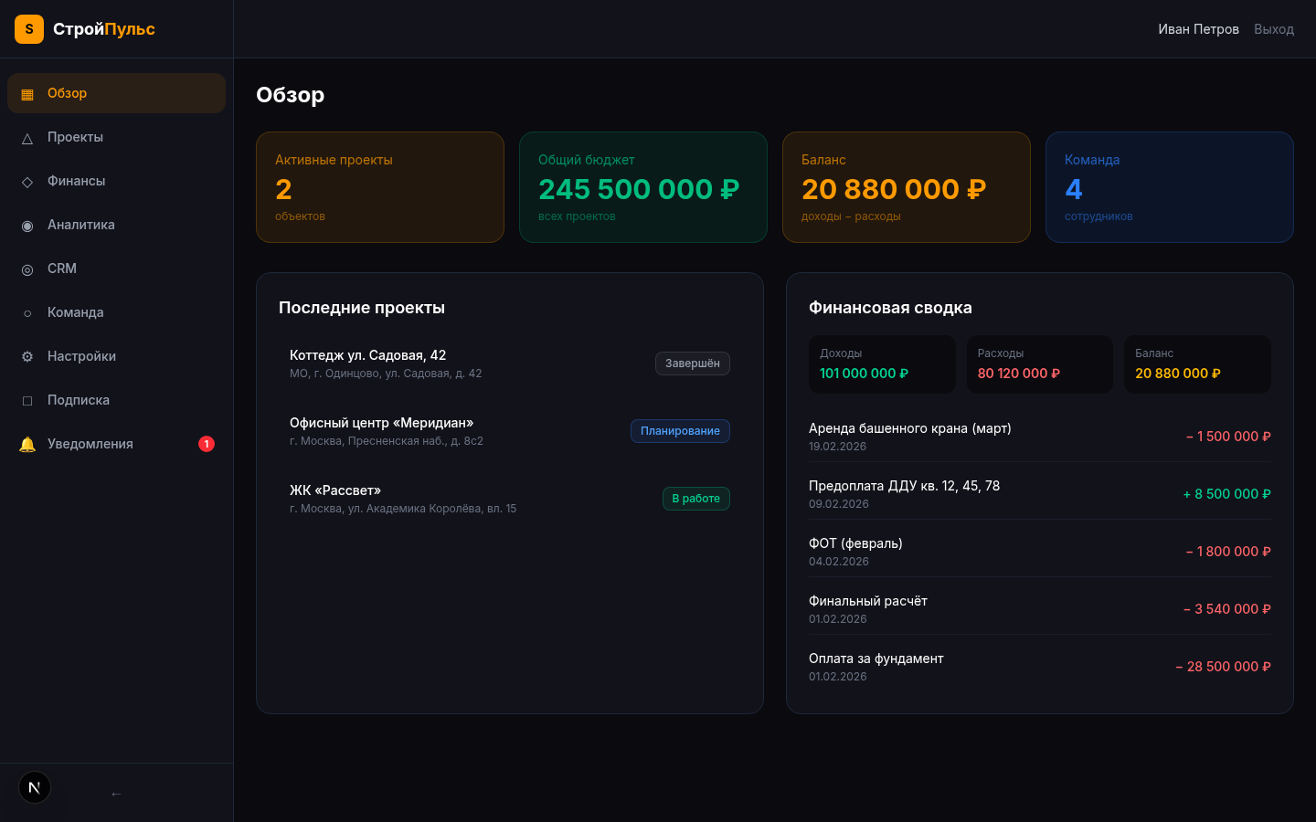 Единая платформа для строительных компаний: сметы, договоры, финансы, аналитика, CRM и управление этапами — всё в одном окне.
